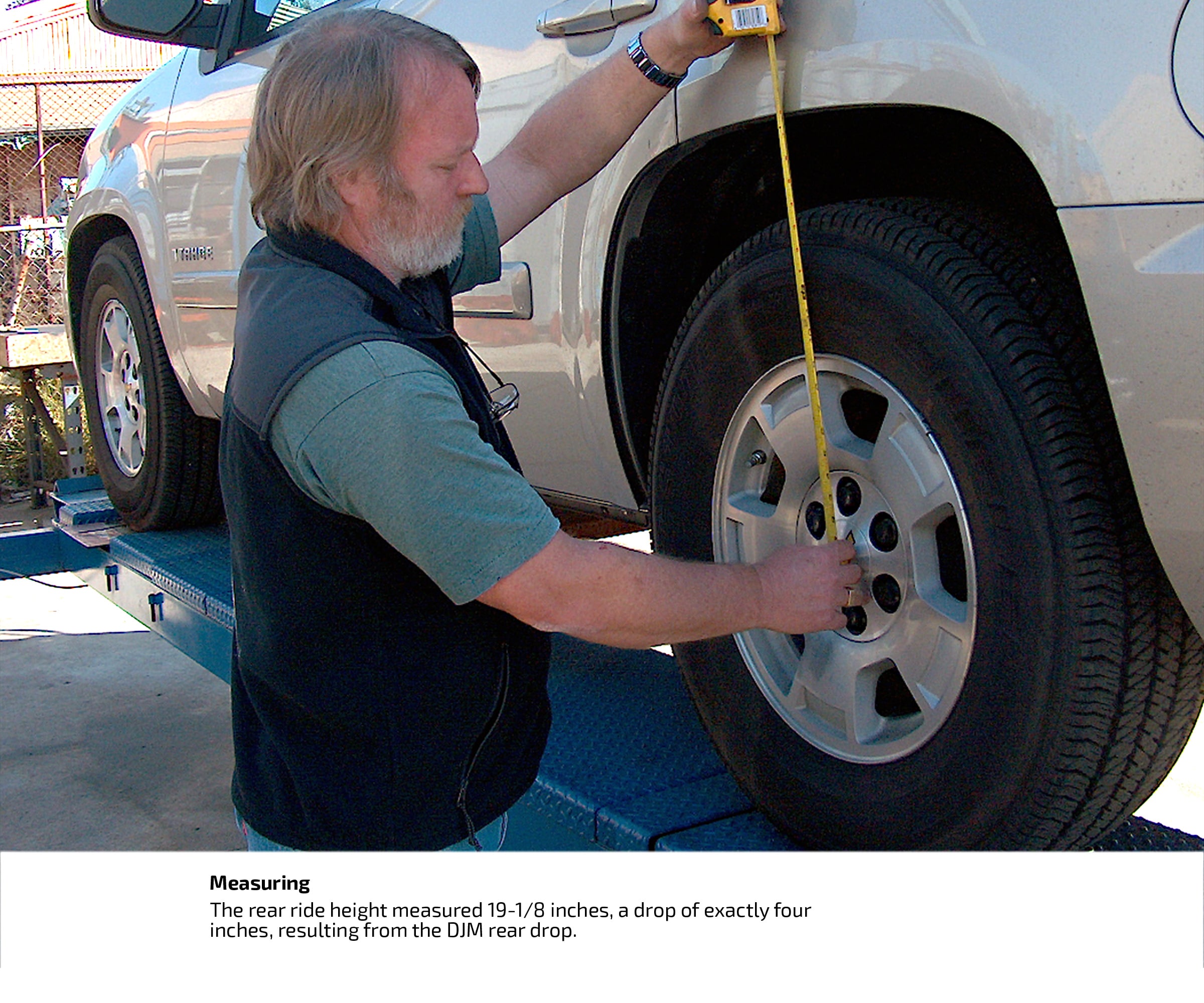 The stock rear ride height of the new Chevy Tahoe is 23-1/8 inches measured from the center of the hub to the lip of the fender well. The front measured 20 ¼ inches. Someone somewhere decided that the three-inch rake is fashionable. That same someone must be responsible for the fact that the rear ends of most new American vehicles are noticeably higher than the front ends. Nevertheless, most of us who love motor vehicles seem to agree that the "ass-in-the-air" configuration isn't exactly everyone's ideal. In any case, the engineers at DJM Suspension in Gardena, CA, not only set out to change the stance of the "down-in-the-mouth" Tahoe with their newly introduced leveling kit and their 2-3 drop kit, but they've just launched a brand-new 3-4 drop kit for the '07 Tahoe. The front drop is based on newly engineered upper and lower control arms. DJM drops the rear by installing new coil springs; relocating the sway bar and changing the angle of the trailing arms. It is basically the same engineering as DJM drop kits for the Suburbans and Tahoes of old. The engineering has stood the test of time. The installation is relatively quick, easy and straightforward. The result is a Tahoe, Chevrolet's sizable, heavy, bulky SUV, with a greatly improved stance that becomes aggressive and nimble at the same time with ride and handling that is every bit as good as the stock suspension.